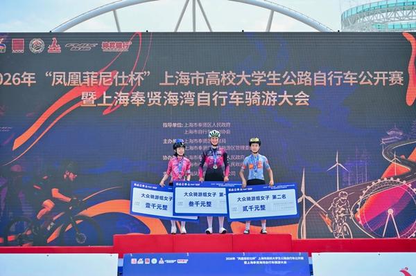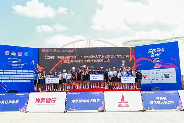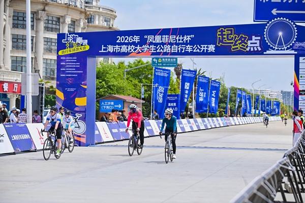 4月19日,2026“凤凰菲尼仕杯”上海市高校大学生公路自行车公开赛暨上海奉贤海湾自行车骑游大会在奉贤海湾旅游区渔人码头鸣枪开赛。本次赛事以“骑聚海湾,马力全开”为口号,29支高校车队约2100名选手从渔人码头出发,踏上全长55公里的“南上海最美赛道”,在森林与海浪之间展开一场速度与风景的对话。
