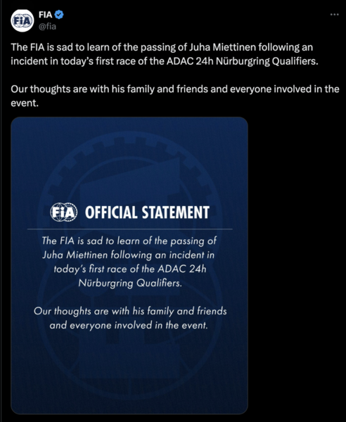 国际汽联(FIA)也在官网发文哀悼:“FIA获悉尤哈·米耶蒂宁在今天(18日)的纽博格林24小时耐力赛首场比赛中因事故不幸去世的消息后深感悲痛,我们同他的家人、朋友以及所有参加此次赛事的人们同在。”