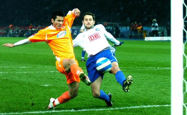 2007年3月16日,效力德甲科特布斯队中国球员邵佳一(左)在对阵柏林赫塔队的比赛中射门。 新华社记者吴晓凌摄