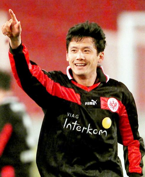 2000年3月10日,效力德甲法兰克福队的杨晨在对阵斯图加特队的比赛中庆祝进球。新华社发