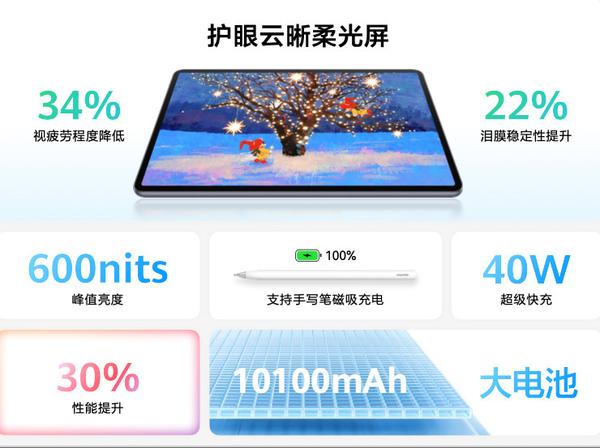 屏幕升级是这次MatePad 11.5的最大亮点。它采用了11.5英寸的护眼屏,拥有2456×1600的高分辨率和120Hz的刷新率。同时,该屏幕还搭载了圆偏振光技术,将原本发出的线偏振光转换为更均匀的圆偏振光,模拟自然光线,为用户带来更加舒适和健康的视觉体验。此外,用户还可以选择云晰柔光屏版本,该版本通过结合纳米蚀刻技术和纳米磁控镀膜工艺等技术,有效消除了平板表面的环境干扰光,增强了屏幕透光率,带来了舒适护眼、清晰透亮、纸感书写、顺滑触控的全方位体验。