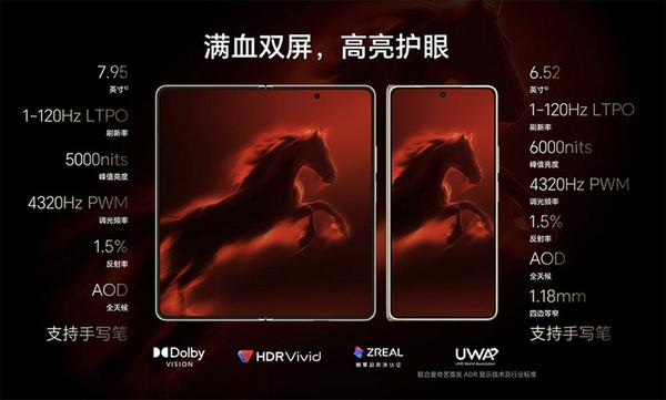 视觉体验上,荣耀Magic V6配备了7.95英寸2K内屏与6.52英寸外屏,支持1-120Hz LTPO自适应刷新率及4320Hz超高频PWM调光,峰值亮度高达5000尼特。屏幕表面覆盖了行业独有的5600层氮化硅工艺“至臻黑钻屏”,并结合抗反射高精镀膜技术的“金钢巨犀玻璃”,实现了抗反射、耐摔、耐磨、耐刮的四重防护。针对用户痛点,新机采用新一代超韧UTG玻璃,使折痕改善幅度达44%,并通过SGS无感知折痕认证,带来近乎完美的平整度。