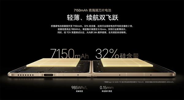 而在备受关注的电池领域,该机展现了惊人的实力。其1TB顶配版本首发了名为“青海湖刀片电池”的新技术,容量高达7150mAh,成为业界首款突破7000mAh大关的折叠屏设备。该电池硅含量达到32%,是行业平均水平的两倍,叠层厚度仅0.15毫米,能量密度更是攀升至985Wh/L,性能表现甚至超越部分车规级动力电池。而对于其他版本,荣耀则联合ATL推出了第五代硅碳负极技术,将电池容量稳定在6850mAh,同样处于行业领先地位。