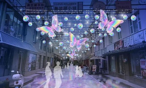 在美兰西湖,每一盏灯都是一句未说完的情话。“金罗展新卷”——罗朵朵手执彩灯,蝴蝶绕光而生,似古镇新生的羽翼。