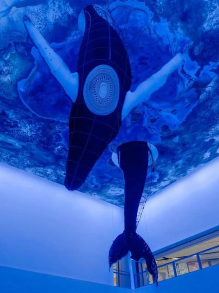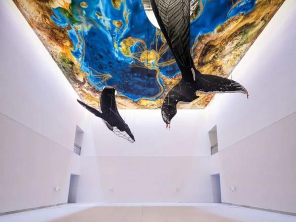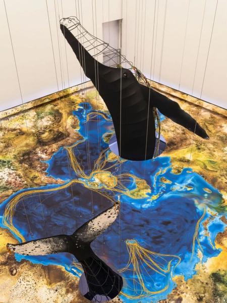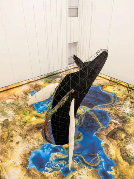 该作以两头真实存在的座头鲸“巴特曼”与“阿莉亚”为原型,通过这一大型装置等比还原了这两头鲸鱼的形象。展览将这两段带有史诗感的生命史引入浦东美术馆最具标志性的中央展厅,在沉浸式艺术现场中,深度聚焦海洋生态、海洋健康及跨物种共存等当代议题。