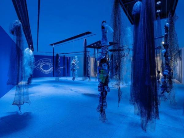 展览的公共维度进一步延伸至浦东美术馆B1空间。在该展厅,艺术家与来自上海多所学校的学生共同完成装置作品“幽灵网”。作为“鲸鱼的致敬”的衍生装置,该作品采用从海洋中真实回收的废弃渔网作为主要材料,这些长期漂浮于海洋中的“幽灵网”被视为海洋生命面临的最致命威胁之一。