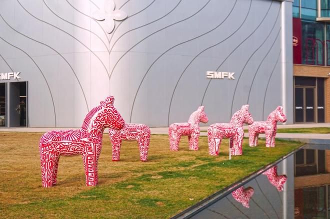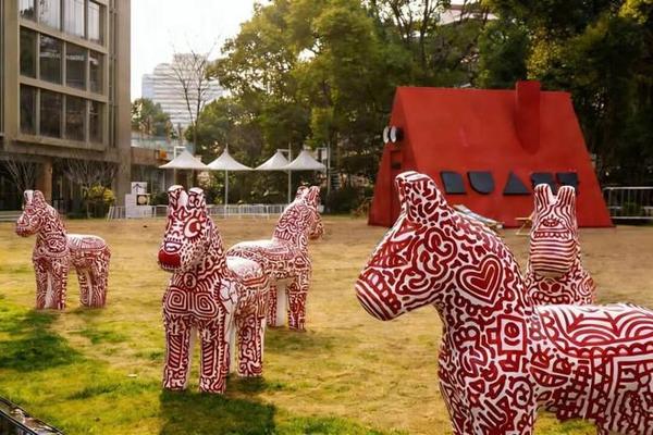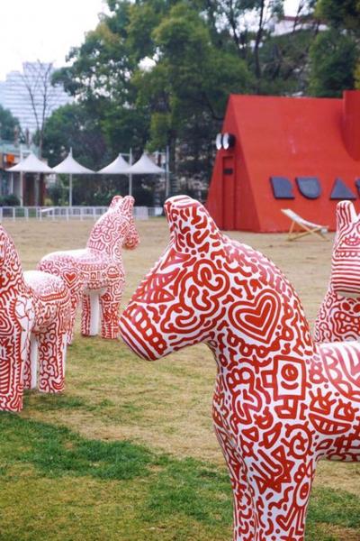 马年新春临近,俄罗斯艺术家stas khomich把他标志性的“红纹”涂鸦带到了永源路。他用一种很“野”的方式,把古典的东方意象和街头潮流玩出了火花。户外大草坪上,8匹红白涂鸦小马并肩而立。