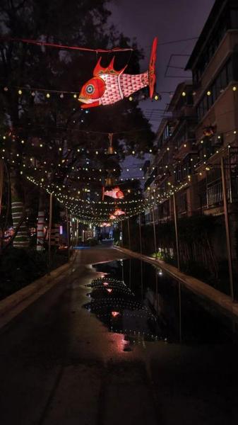 白天的永源路是潮流主场,到了晚上,这里就变成了温柔乡。树梢上挂着的鱼灯,红色的鳞片泛着柔光,像极了从老年画里直接游出来的锦鲤,把晚风都吹出了暖意。暖黄色的灯笼串联起整条街,光晕在檐角跳跃。