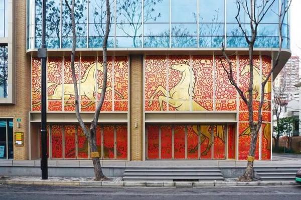 艺术家把对 “新生” 与 “潮流” 的理解,揉进了永源路的肌理里。永源路的建筑本身就是画布,于是他把 “马” 的意象放大,搬上了沿街的玻璃幕墙。金底红纹的巨马昂首跃起,涂鸦纹路与草地上的小马遥相呼应,像是一场跨空间的对话:草地上的小马是 “初生的热烈”,墙面上的巨马是 “成长的锋芒”。