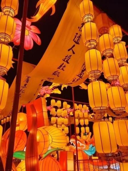 带娃穿梭在诗意满满的黄色灯笼海,品读旗幡上的诗词,欣赏湖面荷花花灯的绝美倒影,感受古风年味。
