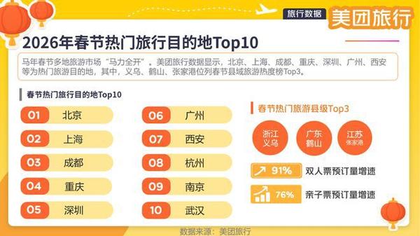 2月23日,美团发布的《2026春节消费洞察报告》显示,受返乡团圆、反向过年等多种出行需求场景激发,北京、上海、成都、重庆、深圳、广州、西安、杭州、南京、武汉为热门旅游目的地Top10。