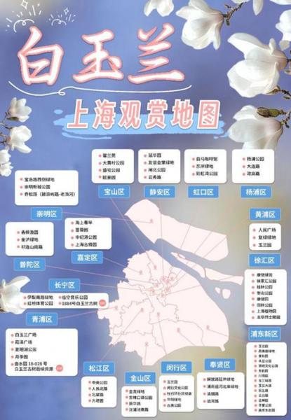 最新上海白玉兰观赏地图,包含73个观赏点位(道路、公园绿地、绿道)和2个古树及古树后续资源观赏点位。预计今年上海白玉兰最佳观赏期在2月24日至3月2日,受不同区域小气候差异影响,各赏花点花期略有错落,整体观赏期在两周左右。图片来源:上海市绿化市容局