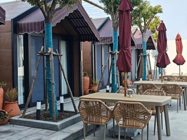 主楼北侧是两排稻田景观小木屋,围合而成的小广场有水池锦鲤,还有户外桌椅,适合夏季夜聊观星。