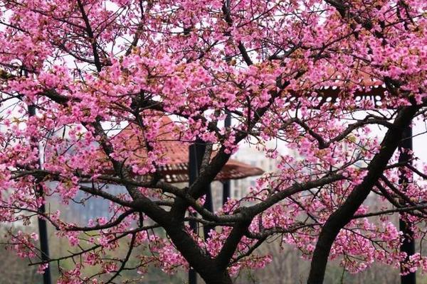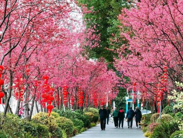中兴公园的福建山樱花正值盛花期,满树繁花晕染出浓郁的深绯红色。这抹热烈的红在城市景致的映衬下格外夺目,恰似簇簇燃烧的火焰,为城市的角落添上一抹灵动与生机。