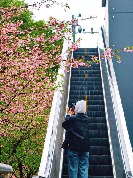 从3号口或4号口进出站,便踏入了一个樱花织就的童话。阶梯一侧樱树整齐排列,枝条在上空温柔伸展,繁花如云,铺成一条通往春天的甬道。