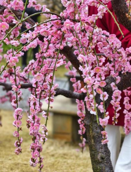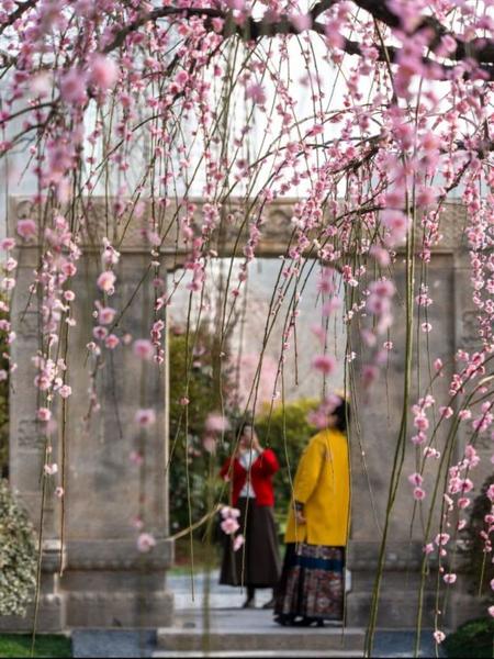 这里有200余棵垂枝梅,枝条如流瀑般垂落,柔韧且舒展。