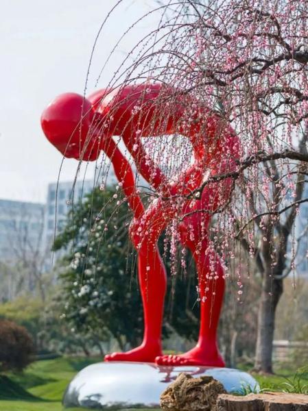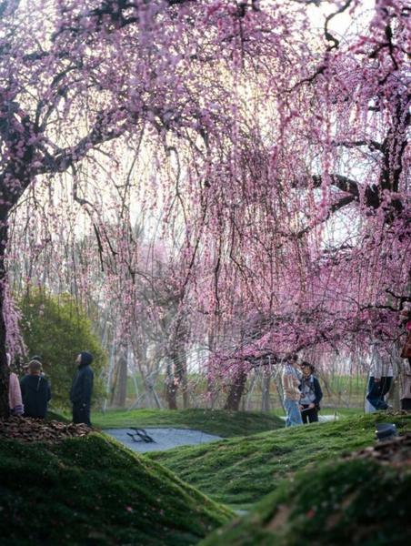 这里的垂枝梅,生来就带着艺术氛围感。盛放的花瀑与园内雕塑作品彼此映衬,硬朗的线条遇上柔美的花枝,刚柔碰撞出独一份的春日画卷。