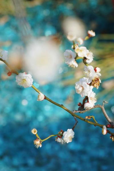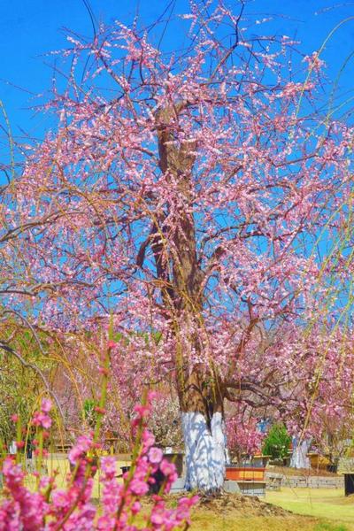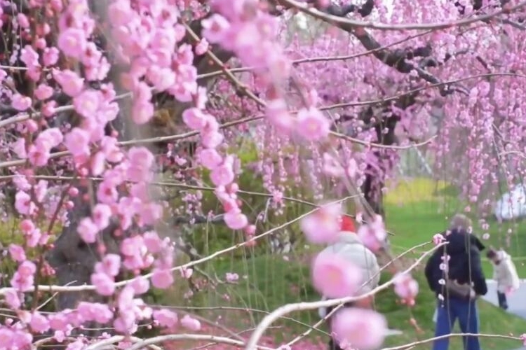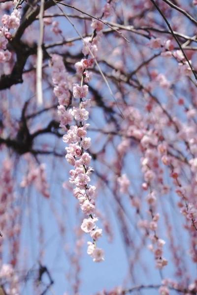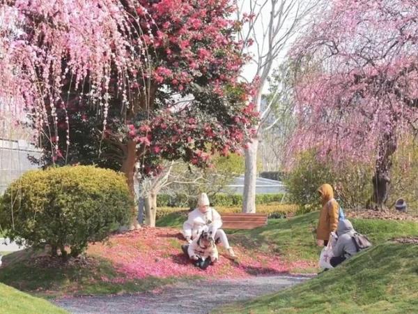 不想远走,在市中心就能赴一场垂枝梅之约。沿公园小径漫步,远远就能望见垂枝梅景致。