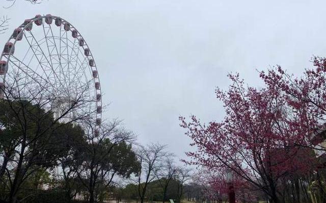 儿童游乐园摩天轮附近的钟花樱是小众惊喜,几株钟花樱与摩天轮同框,粉色樱花搭配梦幻摩天轮,随手一拍就是童话感满满的春日画面,适合亲子打卡或情侣拍照。