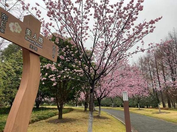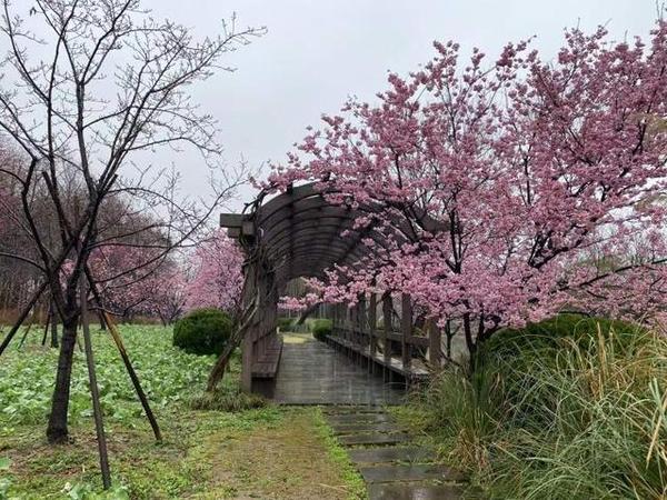 这片樱花林是早樱打卡首站。进门左转沿大路至樱花林站,大片椿寒樱已然盛开,垂枝造型沾着雨露,粉色花瓣层层叠叠,随手一拍都是春日大片。旁侧的木栈道是公园最早栽种樱花的区域,河津樱温柔绽放,沿着木栈道漫步,两侧花朵簇拥,沉浸式赏樱的氛围感拉满。