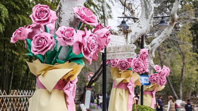 巨大的粉色花束被高高悬挂在树干上,与繁茂的枝叶相互映衬,仿佛是大自然与人工巧妙融合的艺术品。