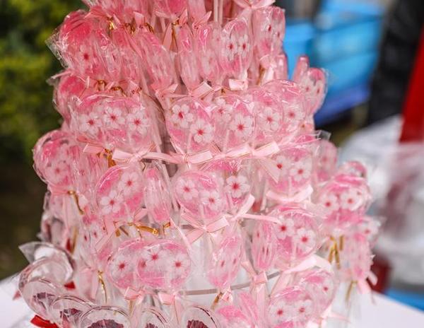 在樱花岛区域,一排特色花车集市成为游客的打卡热门,集市上,各种与樱花相关的美食让人垂涎欲滴。