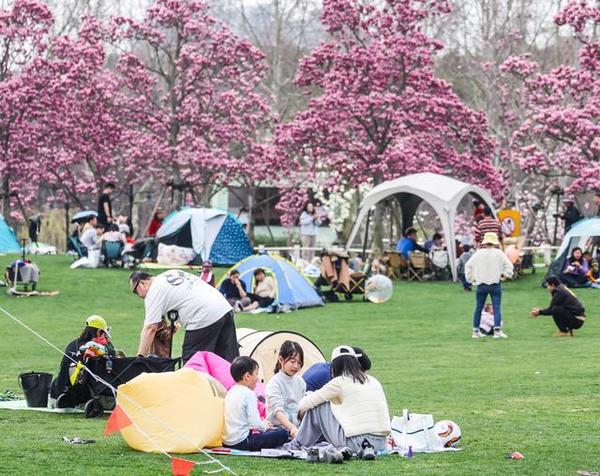 在草坪区域,大批前来露营的市民搭起的帐篷,小朋友们在草坪上快乐奔跑,大人们在阳光下谈天说地、品尝美食,幸福祥和的景象与盛放的紫玉兰与白玉兰相映成趣。