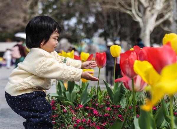 公园内多种春花正值盛花期,层叠的花海、雅致的花径让人流连忘返。音乐喷泉附近,成片的郁金香绚丽绽放,花瓣在阳光照射下勾出金边,透出迷人的轮廓。