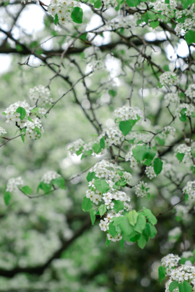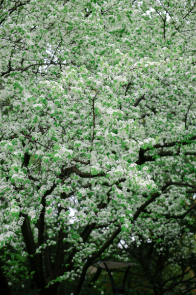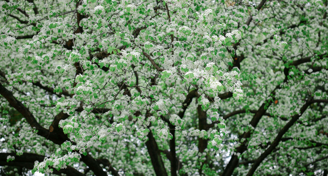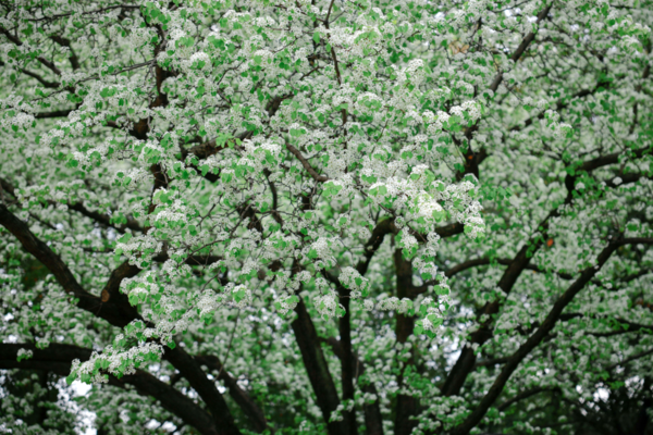 从远处看,满树梨花如同落满白雪的伞盖