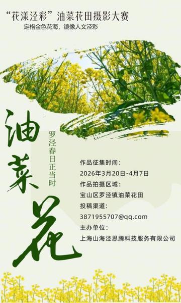 ·作品要求:单幅或组照(≤5张)均可,拍摄器材不限,拍摄地点为罗泾镇域范围区域,如油菜花打卡点:花红村咖啡馆周边千亩良田、塘湾村宁东路两侧、宝虹家园南侧、宝丰村泾恩路西侧、洋桥村蕰杨路西侧等。