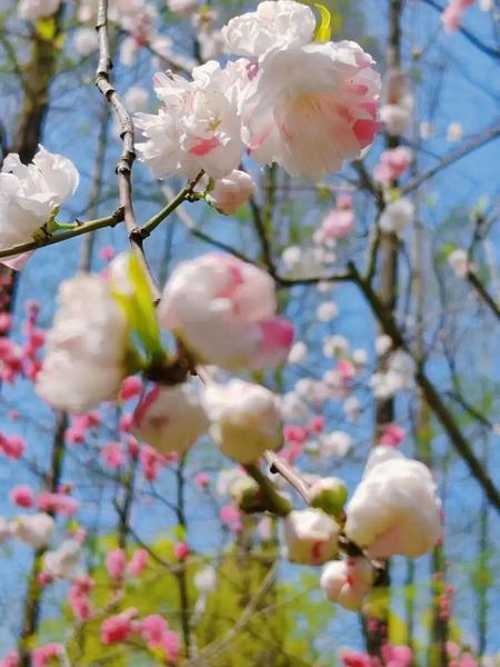 最引人注目的当数五色碧桃,又名撒金碧桃。据公园养护部负责人介绍,该品种观赏价值极高,花瓣底色纯白,却又带着一丝浅红,部分花朵红白交错,如同娇羞的少女。细长的菊花桃花瓣形似菊花叶片,整树灿烂盛开,宛如夜空中绽放的烟花,成为桃林中一道耀眼的风景线。