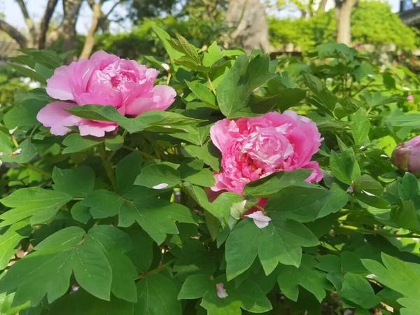 古牡丹与公园的中式建筑、古树相互映衬,历史感与春日生机交融。