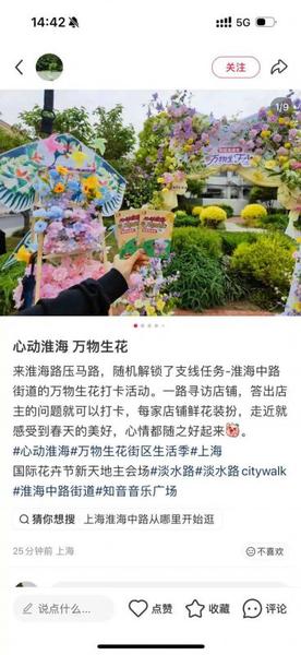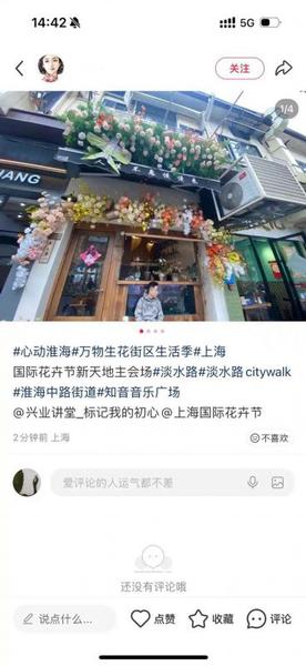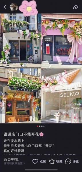 “刷到预告特意来的,拍了好多有氛围感的照片,准备发小红书当我的春日首更。”完成所有打卡任务后,很多年轻人自发分享小红书探店笔记,“淡水路Flower Walk”一下子成为新晋潮流,让这场探店之旅更具仪式感。一时间,氛围感十足的笔记刷屏社交平台,淡水路的春日景致、特色小店的独特魅力被广泛传播,成为这场Flower Walk的点睛之笔,也让这些藏身小马路的青春小店成功出圈。