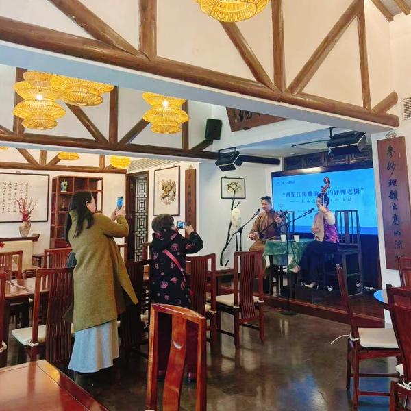点一杯醇香咖啡坐在窗边,一边欣赏如云似霞的紫藤花景,一边沉浸式聆听婉转悠扬的评弹。吴侬软语伴着琵琶三弦,声声入耳,韵味悠长,江南的诗意与烟火气,在此刻完美交融。
