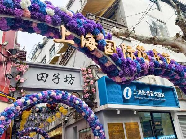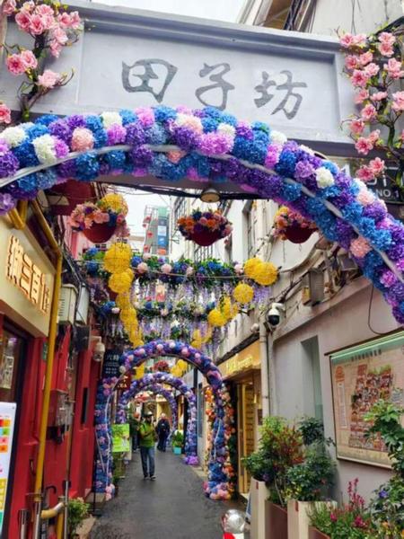 田子坊的门户,是老街区与新花事的第一扇对话窗口。此次花卉节期间,园区一、二、三号门以三大主题景观,完成从通行入口到文化地标的华丽转身。“海派花韵”主题拱门,是花卉节核心视觉符号的集中呈现,在现有艺术花墙基础上,以浪漫紫色为主调搭建多层环形拱门,仿真绣球花簇层层叠叠,霓虹灯带勾勒出柔美的轮廓,老石库门的青砖肌理与现代花艺装置交织,既保留了街区的历史温度,又成为游客打卡留影的第一站。
