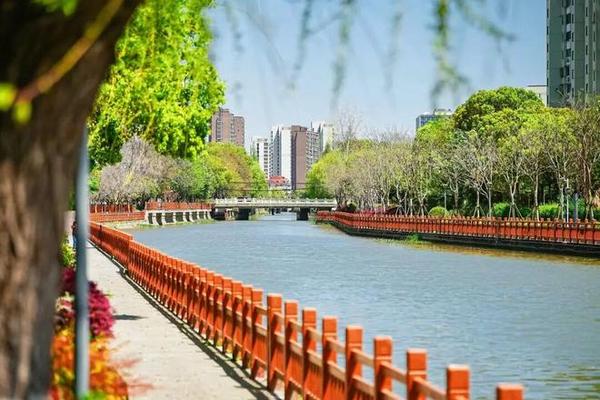 悠悠河水穿城而过,岸边朱红的护栏与新绿的垂柳相映成趣。