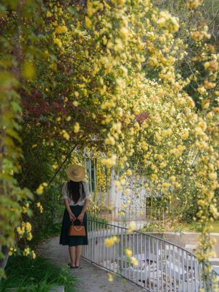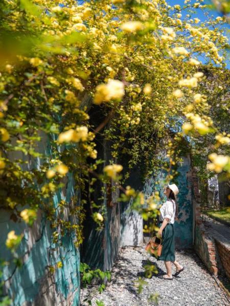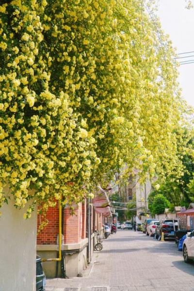 上海最具烟火气的春日浪漫,藏在愚园路的老洋房弄堂里。黄木香顺着红砖白墙肆意攀爬,织成一片金色的花帘。
