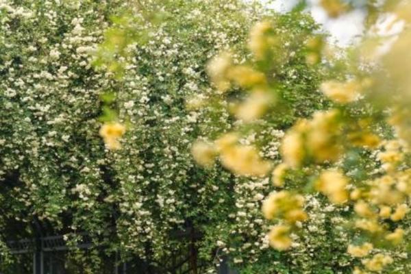 蔷薇园里,黄木香爬满廊架,花香袭人,清雅如蜜,与一旁的白木香相互映衬,织成一幅流动的春日画卷。