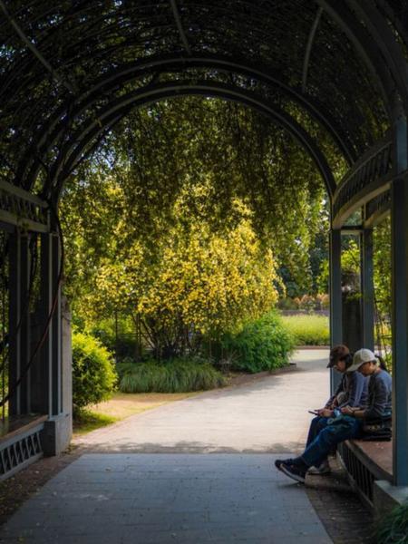 漫步园区,在木香花廊下驻足,感受着淡淡的幽香,看阳光透过花藤洒下斑驳光影。