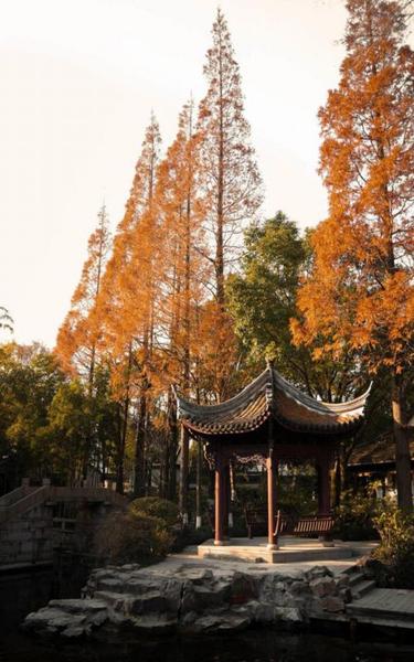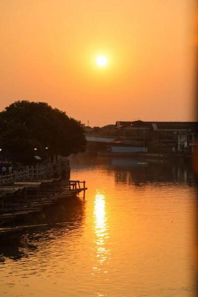 傍晚时分,站在放生桥上看日落,是朱家角最经典的画面。太阳缓缓沉入水天一色,把整条河水染成暖橙色,摇橹船划过,船娘的歌声与粼粼波光一起荡漾。桥上的行人、水中的倒影、远处的黛瓦白墙,都镀上了一层温柔的橙。这份橙色也属于秋天:枝头的柿子橙红饱满,水杉林披上橙褐色的外衣,阳光穿过针叶,整片林子像被点燃的火焰。