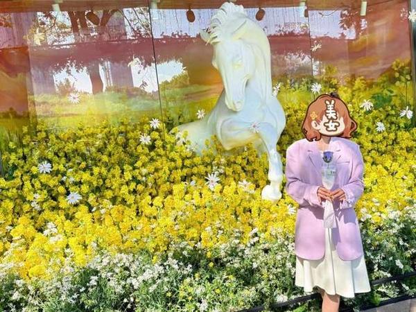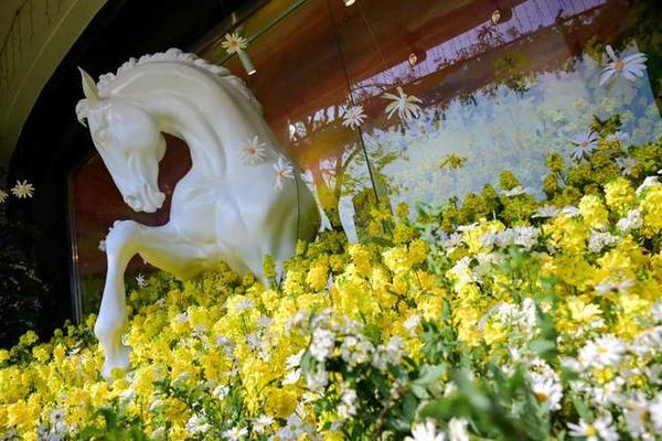记者在现场看到,一匹白马从橱窗玻璃中“探身而出”。白马垂首,像是在聆听花语,明黄的油菜花与纯白的小雏菊交织,把童话里的温柔,都定格在了这里。怪不得橱窗一经揭幕,就吸引了众多市民游客争相拍照打卡>