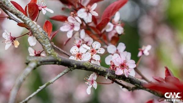 粉白红叶李缀满枝头,