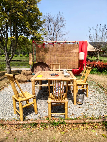 藤编桌椅、复古秋千错落摆放,